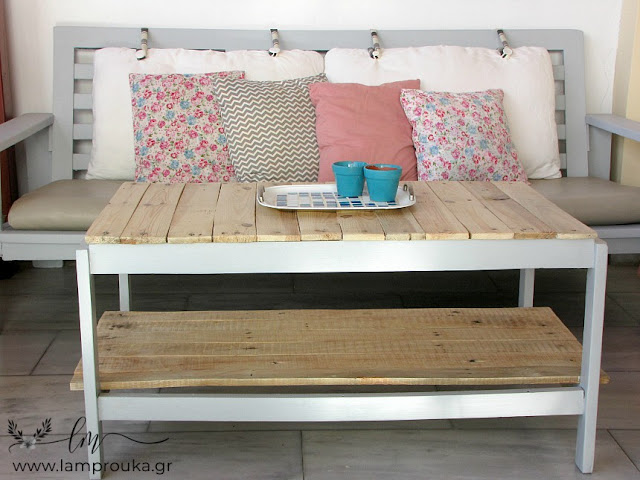 Έβαψα τον καναπέ και τον σκελετό του τραπεζιού με πλαστικό χρώμα, το ίδιο που έβαψα και την παλέτα με τα κρεμαστά λουλούδια. Είναι ένα απαλό γκρι και το πέρασα δύο χέρια. Όταν οι επιφάνειες του ξύλου είναι λείες, τότε το βάψιμο με το πλαστικό χρώμα γίνεται παιχνιδάκι. Βάφει εύκολα και στεγνώνει γρήγορα και μπορείς σε μια μέρα να το έχεις έτοιμο να το απολαύσεις.
